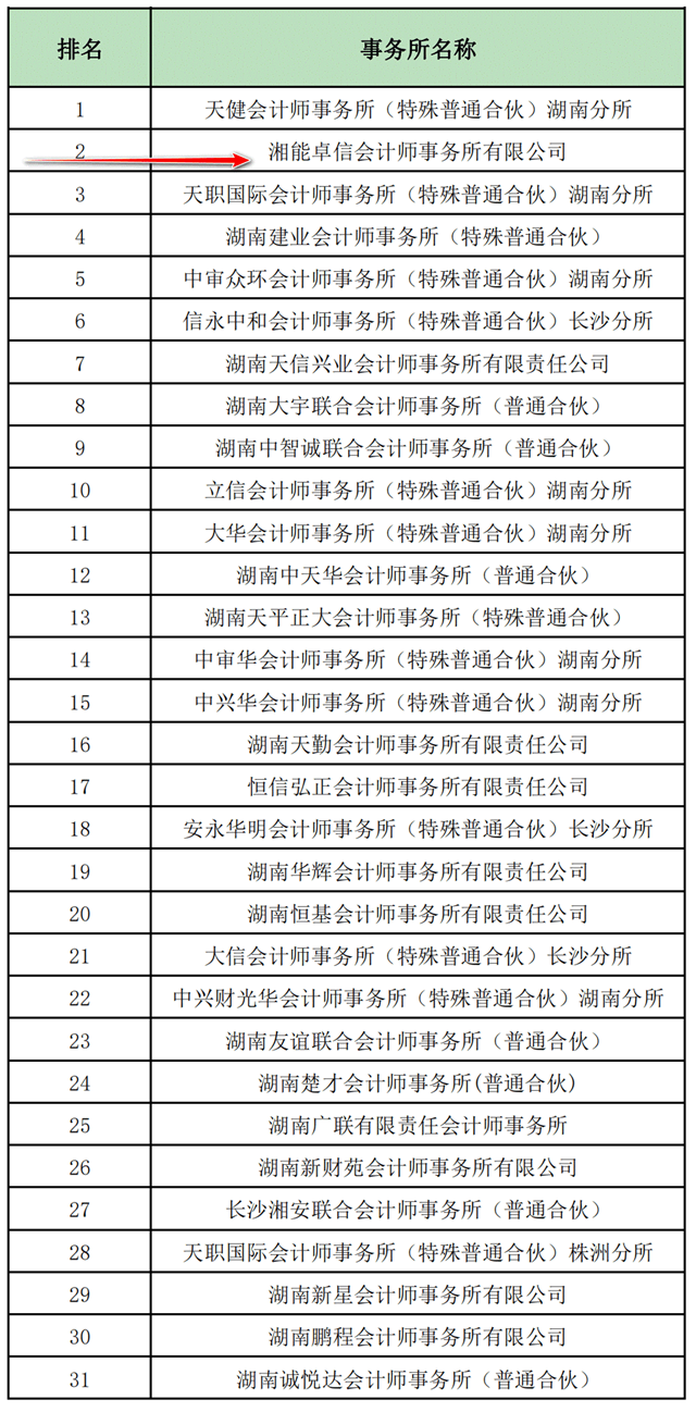 湖南省注協公布的2020年度湖南省會計師事務所前50強信息出爐了,在省50強排名中湘能卓信事務所排名第2位。在早前中注協發布的2020年度全國百強會計師事務所中排名第40位,在全國百強排名中我省共有5家事務所上榜,湘能卓信位列湖南省榜首。