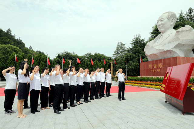 黨支部書記李志成帶領全體黨員同志在胡耀邦塑像前重溫入黨誓詞